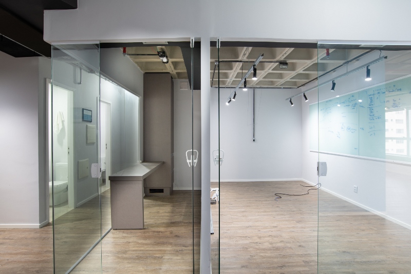 Escritório: Espaço com porta de vidro, ideal para reuniões e trabalho concentrado.